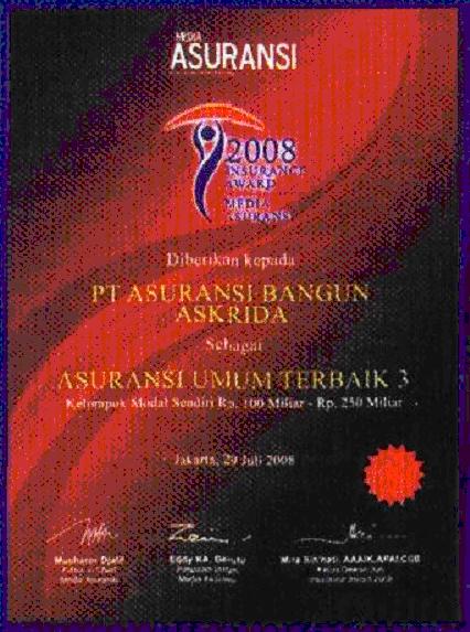 Pada tahun 2008, PT Asuransi Bangun ASKRIDA mendapatkan penghargaan sebagai Asuransi Umum Terbaik 3, yang memiliki aset diatas 100 Miliar - 250 Miliar Rupiah , yang diberikan pada tanggal 29 Juli 2008, oleh Media Asuransi.