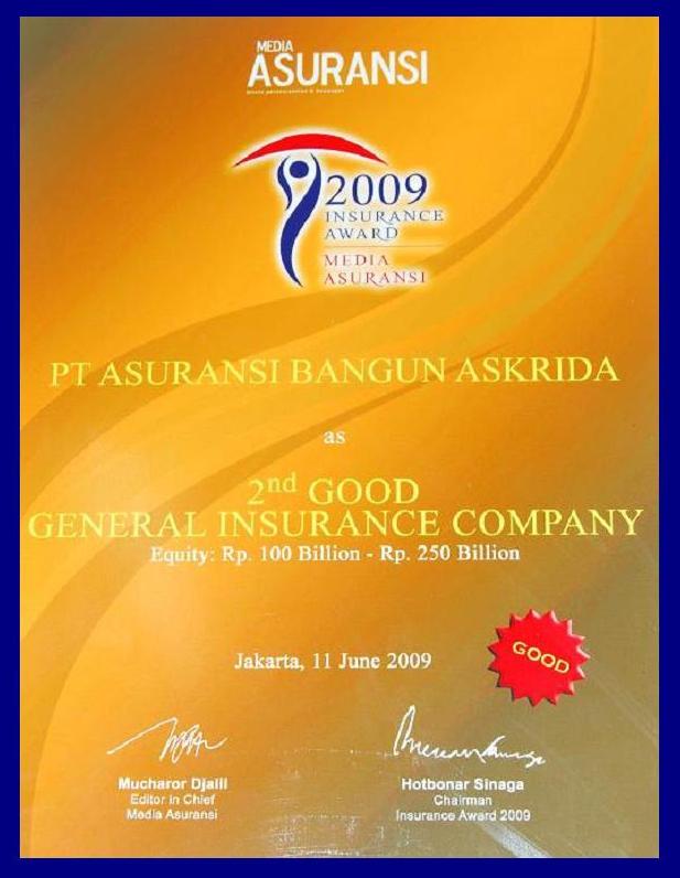 Pada tahun 2009, PT Asuransi Bangun ASKRIDA mendapatkan penghargaan sebagai Perusahaan Asuransi Umum Terbaik 2 dengan aset 100 Miliar - 250 MIliar Rupiah, yang diberikan pada 11 Juni 2009 oleh Media Asuransi.